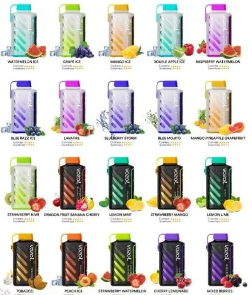 Flavor | Watermelon Ice, Grape Ice, Mango Ice, Double Apple Ice, Raspberry Watermelon, Blue Razz Ice, Lavafris, Blueberry Storm, Blue Mojito, Mango Pineapple Grapefruit, Strawberry Kiwi, Dragon Fruit Banana Cherry, Lemon Mint, Strawberry Mango, Lemon Lime, Tobacco, Peach Ice, Strawberry Watermelon, Cherry Lemonade, Mixed Berries |